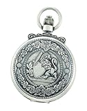 [if Antique Chrome Finish Brass 47mm Double Hunter Case Mechanical Pocket watch. Lifetime Movement Warranty. The watch is packaged in a gift box with a warranty card.]